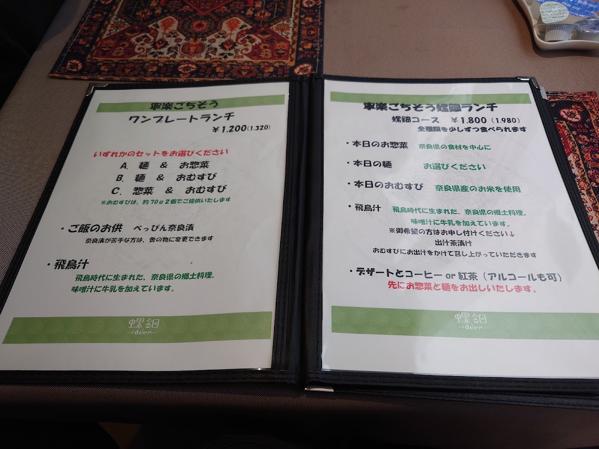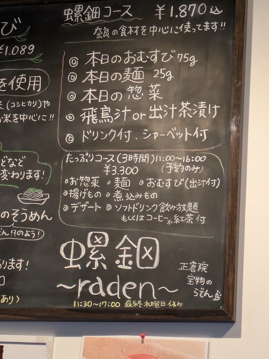 The menu at Raden Nara - Japanese Style Riceball & Local Dishes offers a delightful selection of traditional Japanese dishes with a local touch. One standout option is the Neiraku Omusubi, a beautifully crafted rice ball that promises a taste of authentic Japanese comfort food. For something more refreshing, the Kawakamimura High-grade hand-rolled somen noodles is a must-try, offering a delicate texture and a flavorful experience. The restaurant also highlights local specialties, such as Kogen no ItoNara's local sake, a Japanese sake that perfectly complements the dishes, allowing guests to experience the regional flavors of Nara. These offerings reflect a deep appreciation for Nara’s culinary heritage, making it a great place to enjoy a true taste of the area.